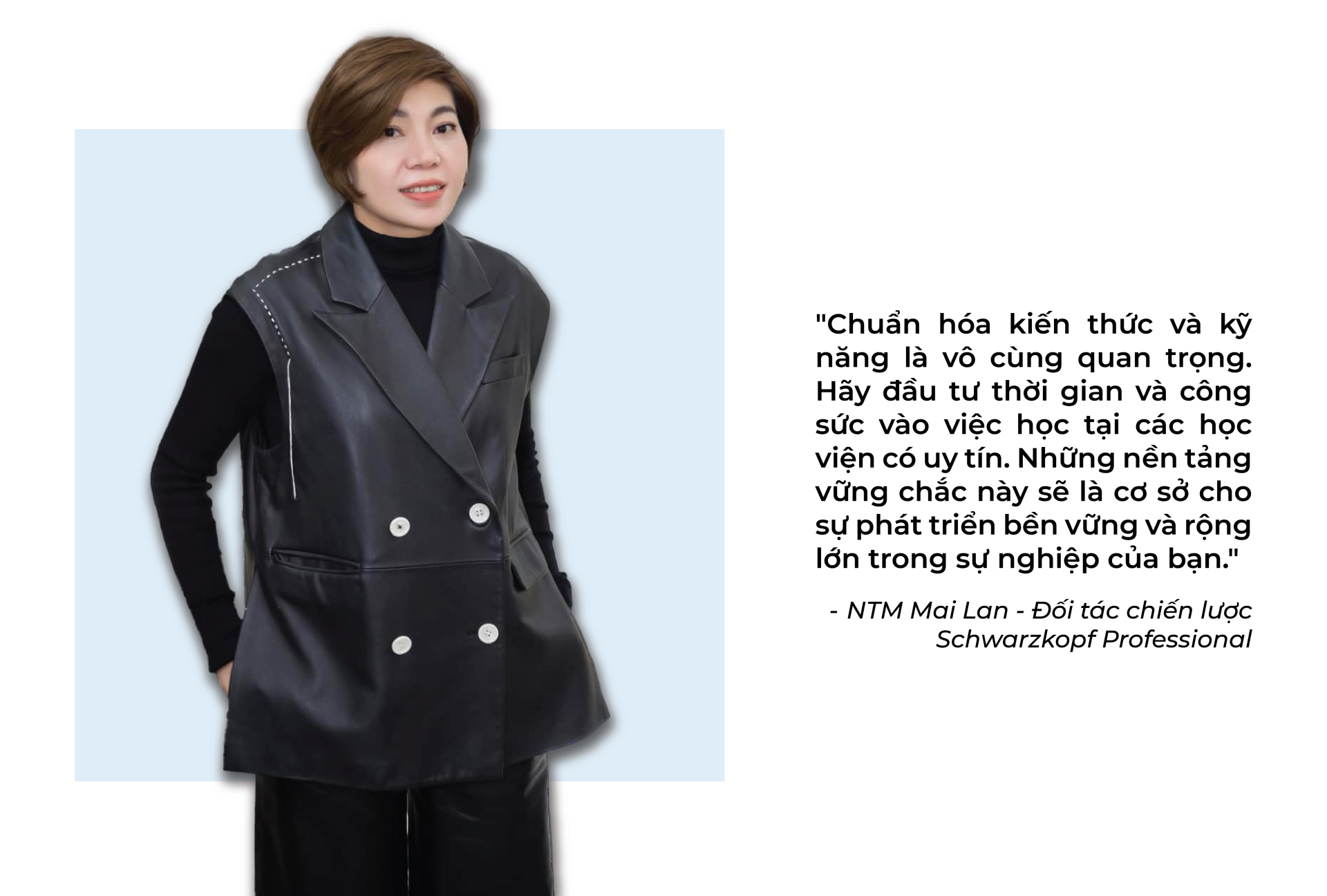 Chia sẻ về cơ duyên với thương hiệu toàn cầu Schwarzkopf Professional, NTM Mai Lan cho biết đó không chỉ là một sự kết hợp ngẫu nhiên, mà là một sự hợp tác dựa trên sự hiểu biết sâu sắc về giá trị và tiêu chuẩn chất lượng. "Schwarzkopf Professional là thương hiệu lớn và có bề dày lịch sử. Hệ thống giáo dục toàn cầu của Schwarzkopf Professional cung cấp những nền tảng chuẩn mực và cách làm việc chuẩn mực. Vì vậy, tôi rất hào hứng khi được làm đối tác chiến lược của hãng." - chị chia sẻ